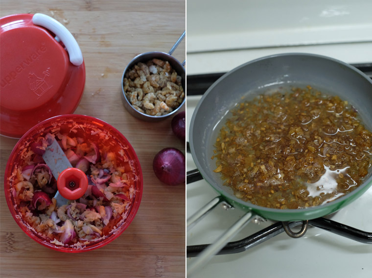 - I use a manual chopper to chop the shallots and dried shrimps, and then fry them in an egg pan.