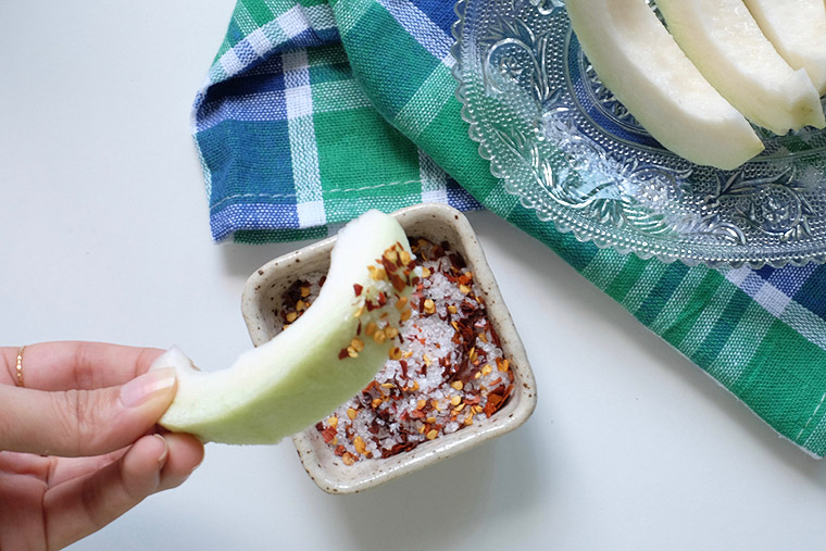 So in my attempt to make fruits more enticing, I thought of flavouring it with a Thai dip: prik-kab-klua. In Thailand, this salt-sugar-chili mixture comes along with fruits that you buy from a roadside stall. The additional tastes – salty, sweet and spicy – gives another dimension to tropical fruits.