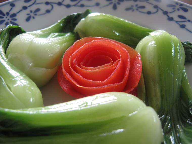 On special occasion such Chinese New Year, I even make food carving on top of beautiful dining ware. One that is incredibly easy to make is carving an edible rose from a tomato.