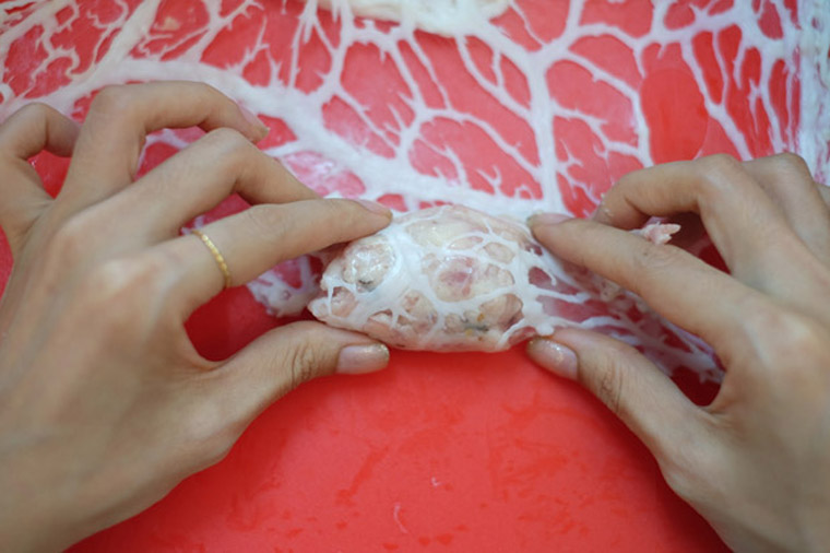 - Step 3 WRAP: Take a spoonful of mixed meat and place onto caul fat. Wrap it tightly