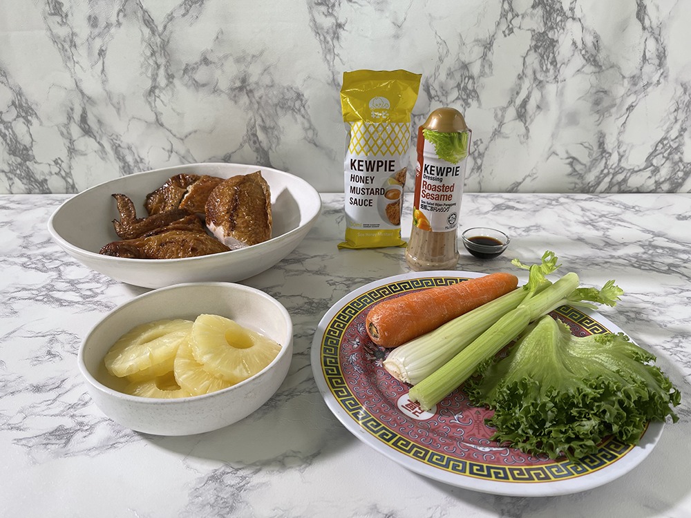 This is what we will do: buy a store-bought roast chicken and turn it into 'Two Way Pineapple Roast Chicken’ with Kewpie’s Roasted Sesame Sauce. Best of all, it can be done in just 15 minutes!