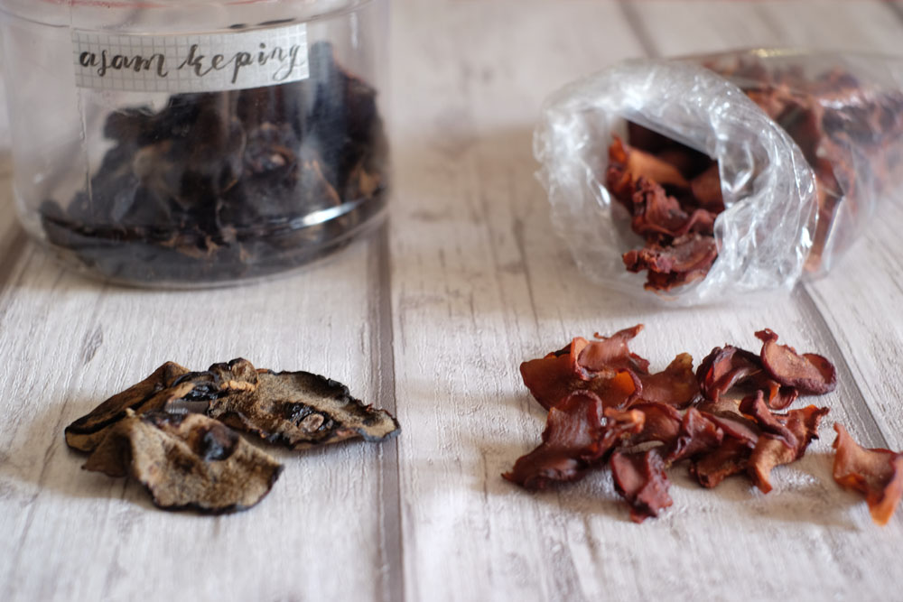 Asam keping/gelugur are sliced and dried fruit used as a cooking condiment in Malaysian cuisine. It comes from a large tree that produced Buah Gelugor (Gelugor Fruit) that is native of peninsular Malaysia.