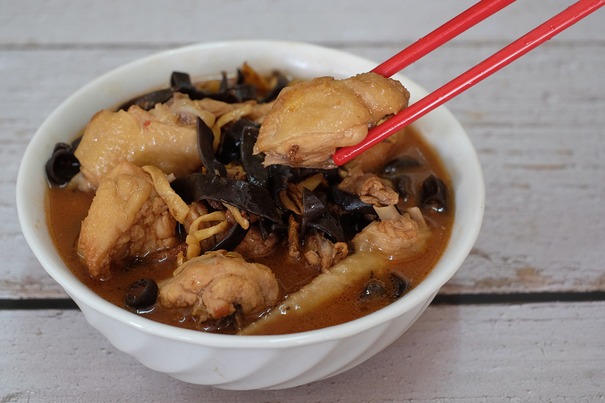 Soak mushroom. Slice ginger and mushroom. Chop chicken into small pieces. Fry 3/4 cup of julienned ginger in 2 – 3 tbsp of sesame oil. Add 500 g of chopped chicken – cook until golden brown. Add 20 g of soaked and sliced Wood Ear Mushroom and fry for a while until fragrant. Add 1 cup water + 1 egg – cover the wok with a lid and braise until chicken soften. Season with 1 tsp salt. Pour 1 cup rice wine. Bring it to a boil. Pour in 1 tbsp whisky and turn off the fire.