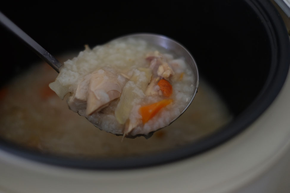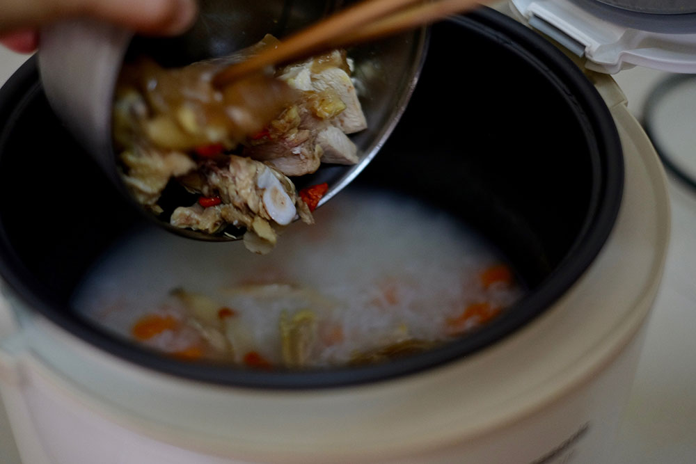 - Step 2 COOK CONGEE: Put washed rice, carrot, leftover chicken, and water into the rice cooker.