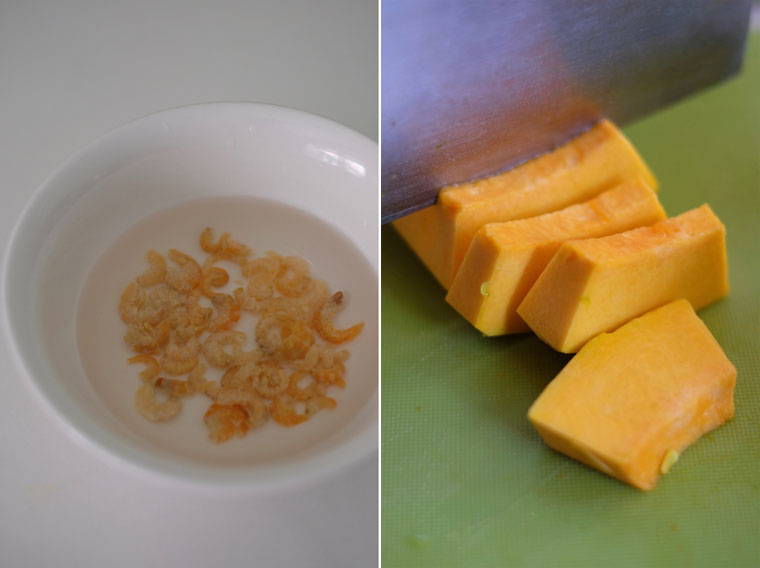 - Step 1 PREP: Rinse dried shrimps and soak them in 1/2 cup of water for 5 minutes (do not discard the water). Chop off the skin of pumpkin and remove its seeds using a knife. Chop into pumpkin into wedges, then into 2 cm thick slices.