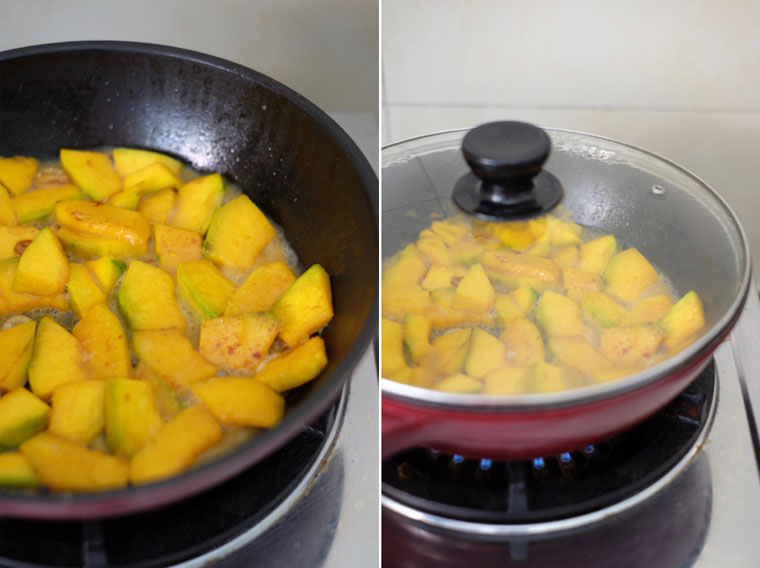 4. SEASON & BRAISE: Pour in water used for soaking dried shrimps and season with salt. Cover with a lid. Simmer until water evaporated and pumpkin softens (about 5 – 10 min)