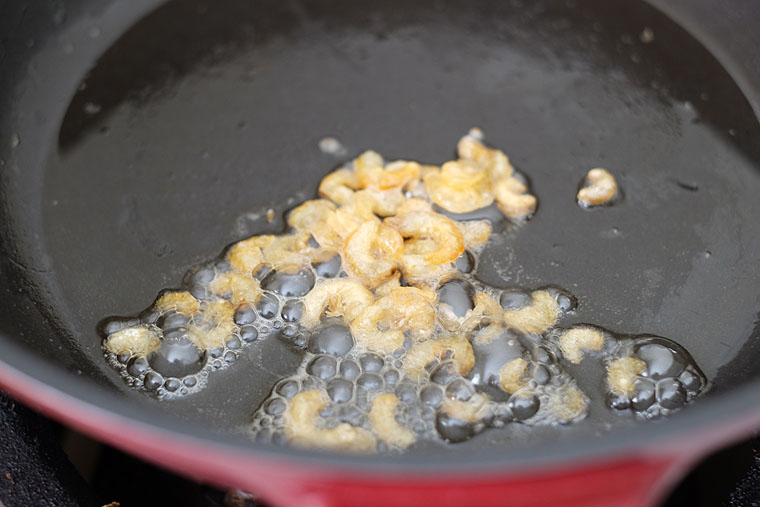 - Step 2 STIR-FRY DRIED SHRIMPS: Heat oil a in wok over medium heat. When oil is sufficiently heated*, add in dried shrimps. Stir-fry until dried shrimp is turns slightly darker and fragrant (about 1 minute).