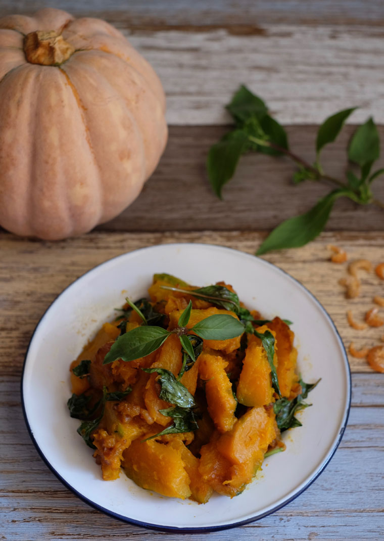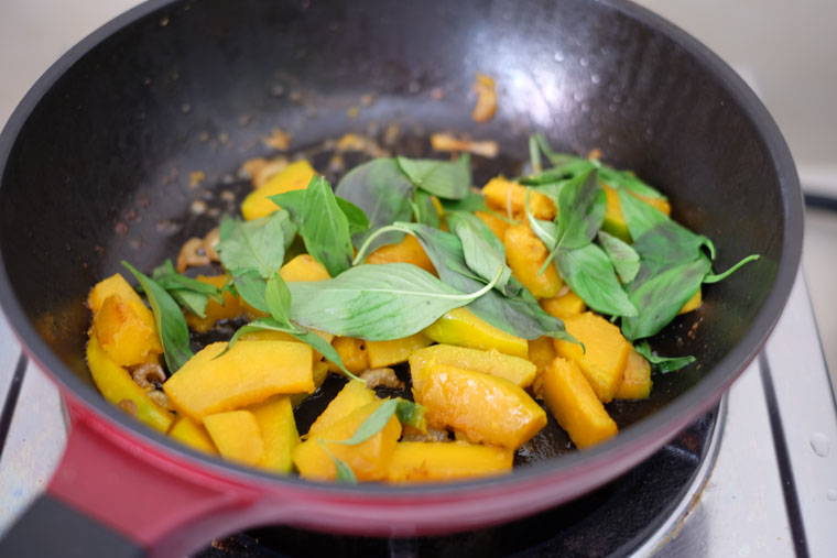 What I love about this dish is that it is not only healthy and delicious, it’s also incredibly easy to cook. You only need 3 main ingredients: pumpkin, dried shrimps, and Thai basil. All these ingredients can be kept for quite a long time in the fridge. Even if I haven’t had the time to do grocery shopping, it’s something that I can whip up easily.