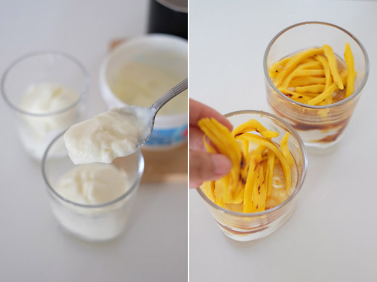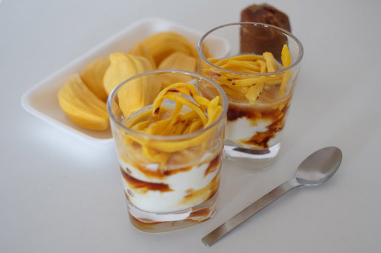 - Step 3 Scoop yoghurt into a clear glass, pour some gula melaka syrup onto it and top with sliced nangka.