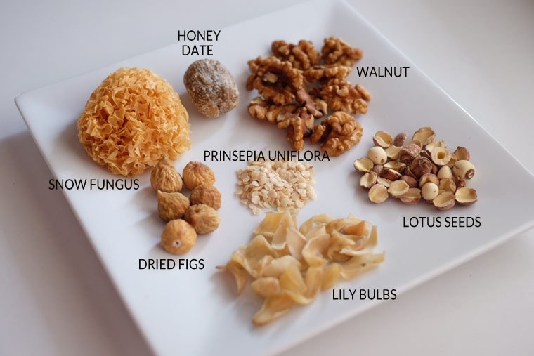Blanch 750 g chicken bones and meat. Rinse herbs (24 g walnuts + 8 g snow fungus + 1 honey date + 4 pcs dried figs + 24 g lotus seed + 8 g lily bulbs + 6 g princspeia uniflora). Boil chicken + herbs + 2 L water in a slow-cooker for 4 - 6 hrs. Season with sea salt.