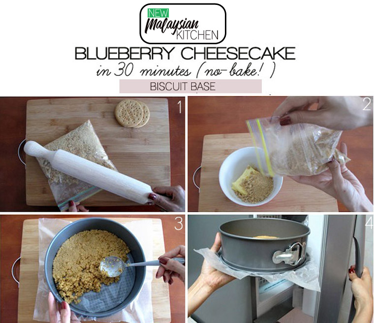 Mix 9 pcs crushed biscuit + 75 g soften butter. Press biscuit mixture into a 20cm cake pan & refrigerate. Beat together 300 g cream cheese + 1/2 cup icing sugar + 1 tsp vanilla extract + 1/2 tsp lemon juice in a bowl until smoot..Whip 250 g double cream & fold it into the cream cheese mixture. Refrigerate overnight. Unmould & spread the blueberry jam on top.