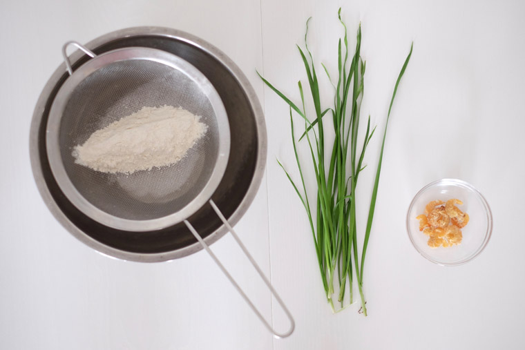 You need only these 3 main ingredients: flour, chives, and dried shrimps. The rest – oil, sugar, and alt – should be found in every cook’s pantry.