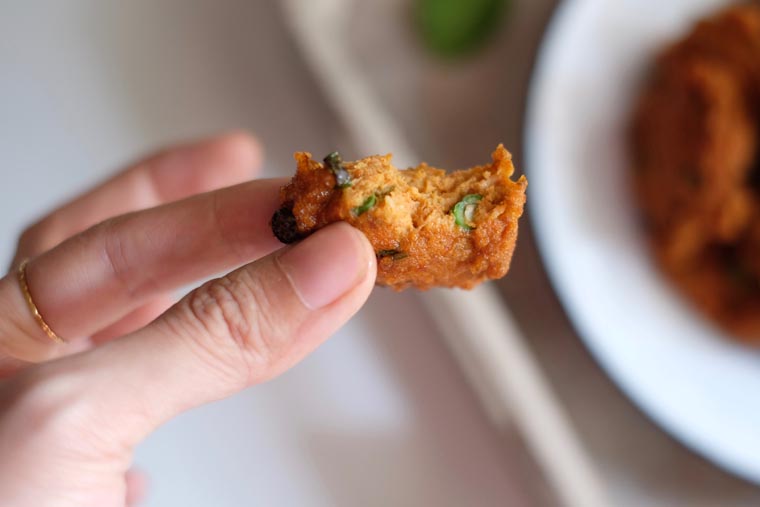 To make this simplified yet still delicious Thai Fish Cakes, you will need to have fish paste, eggs, and long beans as the main ingredients. It is then flavoured with chili paste and kaffir lime leaves powder. Yes, that’s it!