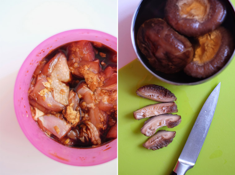 - Step 1 PREP: Rinse and pat dry chicken. Chop chicken into bite-size pieces (5 cm x 5 cm) and place in a large bowl. Rinse rice. Soak mushroom in water until soften, then slice thinly.