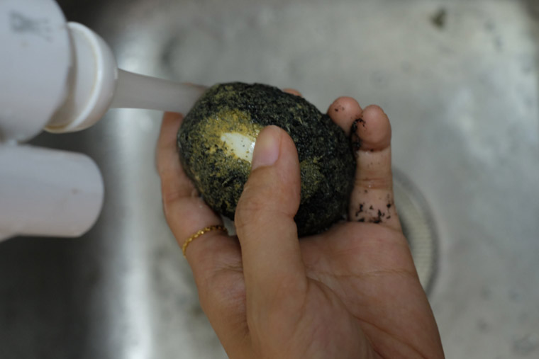 Wash off the salted charcoal layer that covers the egg.