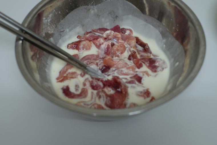 - Step 6 COAT PORK WITH BATTER: Put marinated meat into batter. Mix well, but not too much.
