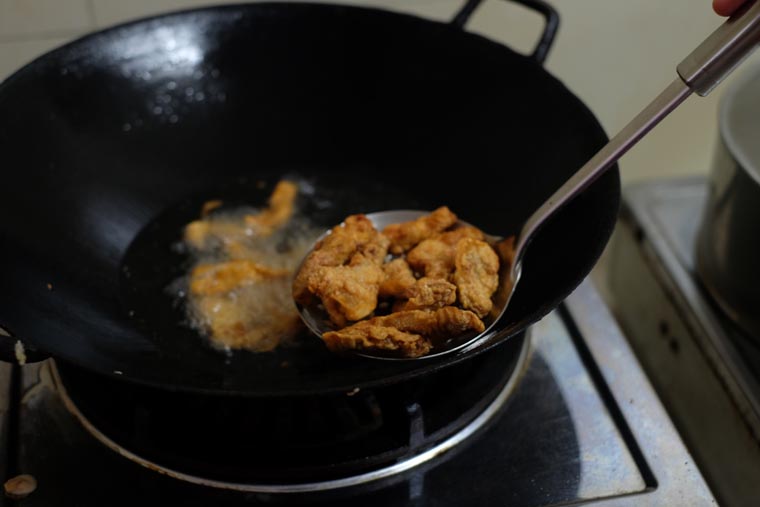 - Step 7 FRY PORK: Place enough oil in wok to cover pork (2 cups). Heat oil. Insert chopsticks, if it bubbles, the oil is hot enough for frying. Turn to medium fire. Add coated meat, piece by piece. Deep fry until batter hardens, about 3 minutes. Remove with a fry skimmer.