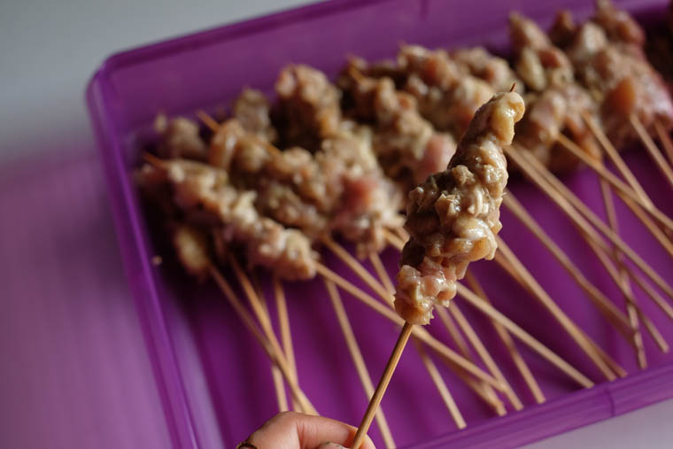 - Ask you friends to help you thread the meat. For a potluck party, I sometimes gather my friends to help me thread the satay.