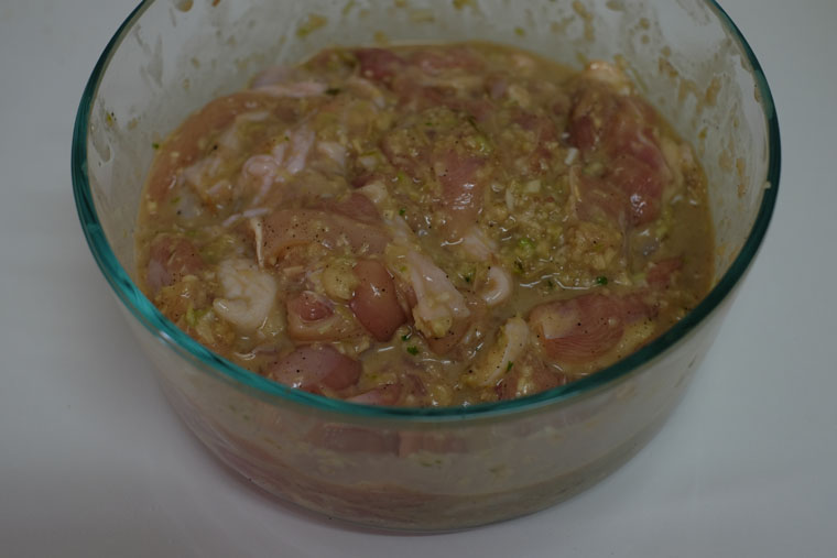 - Step 5 THREAD CHICKEN ON SKEWERS:Poke marinated chicken through bamboo skewers.