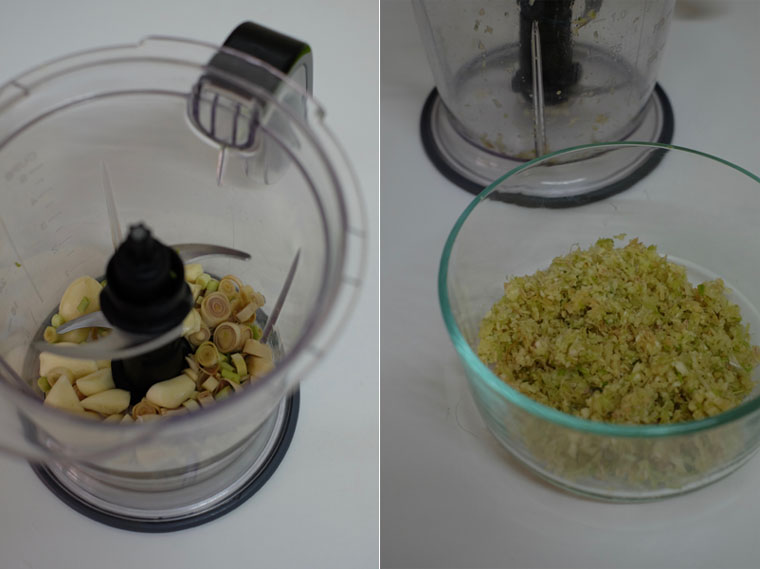- Step 2 BLEND AROMATICS: Blend coriander roots, lemongrass, and garlic into a paste.