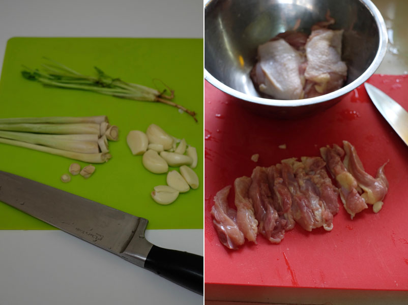 - Step 1 PREP: Peel garlic. Chop lemongrass and coriander roots. Slice chicken into long pieces of about 1 cm width.