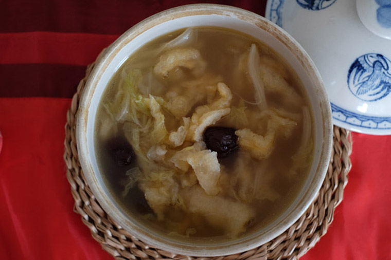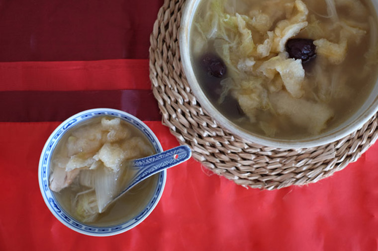 Bring to a boil 1.5 L water + 10 red dates + 3 scallops + 1 ps dried cuttlefish + 600 g chopped cabbage. Simmer for 3 hours. Add 30 g soaked fish maw 10 minutes before serving. Season with salt.