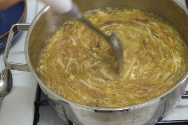 - Step 4 THICKEN SOUP: Pour cornflour mixture into the boiling pot of soup. Stir immediately. Add more or less to achieve the consistency you desire. Lastly, swirl egg into the pot. Stir immediately in one direction to ensure the egg forms thin, long layers.