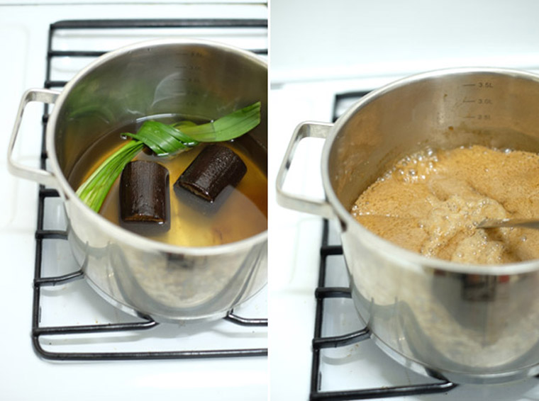 • Step 2 MAKE PALM SUGAR SYRUP: Add 1 L of water, gula melaka and pandan leaves into a pot. Boil on medium fire until sugar is completely dissolved. Remember to close with a lid so water does not evaporate too much (5 – 8 minutes).
