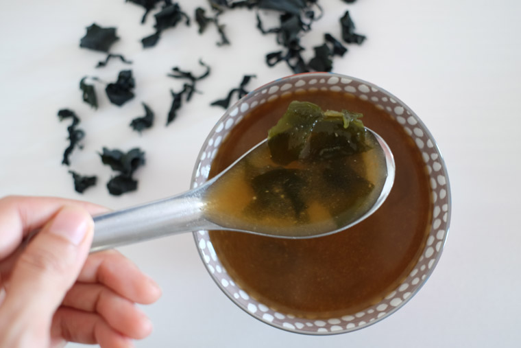 Heat 1 cup of dashi stock. Dissolve 1 tbsp of miso paste into stock. Add soaked wakame.