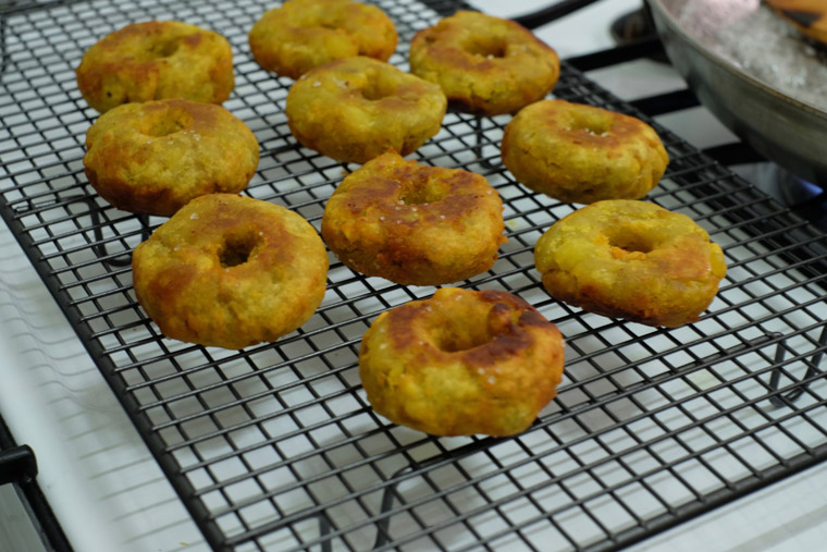 I like biting into a warm doughnut which is crispy on the outside, soft in the inside, and have different kind of sweetness from sweet potato and sugar. Oh, so good!