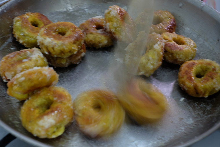 - Add doughnuts into sugar syrup only when the sugar syrup is thick enough. Do not do so when the syrup is still watery.