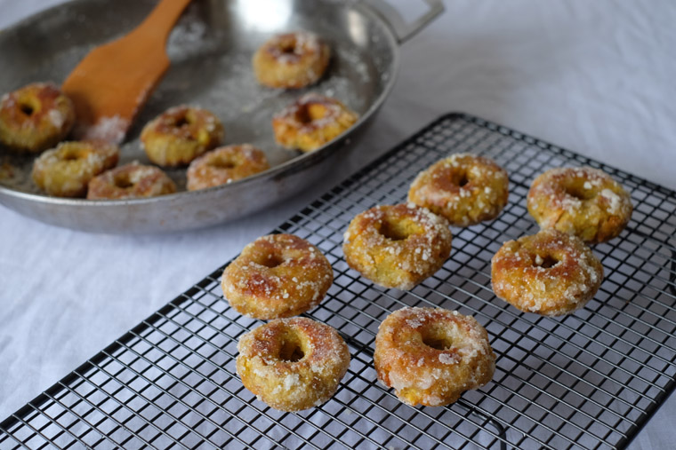 My favourite part of making this dessert is glazing the crispy doughnuts with sugar. It’s almost magical to see sugar syrup turn into beautiful snow-like flakes which stick onto the doughnuts!