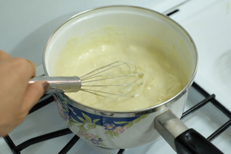 - Step 1 TO COOK MIXTURE: Remove flesh from durian. Add durian flesh, coconut cream, milk and sugar into the pot. Cook mixture in low fire and stir it with a whisk until its mixed well.