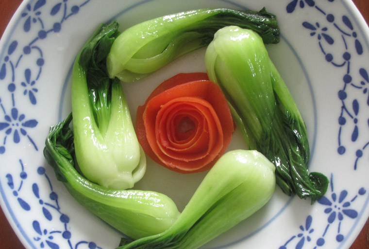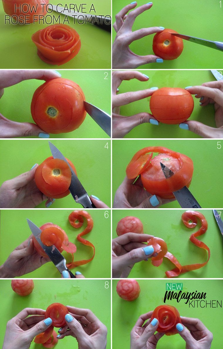 On special occasion such Chinese New Year, I even make food carving on top of beautiful dining ware. One that is incredibly easy to make is carving an edible rose from a tomato.