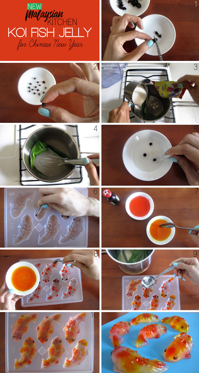 1. You can get koi fish jelly mould at baking supplies stores. They come in many sizes. I suggested getting different sizes for better presentation. Though its much easier to eat the smaller, bite-size ones.