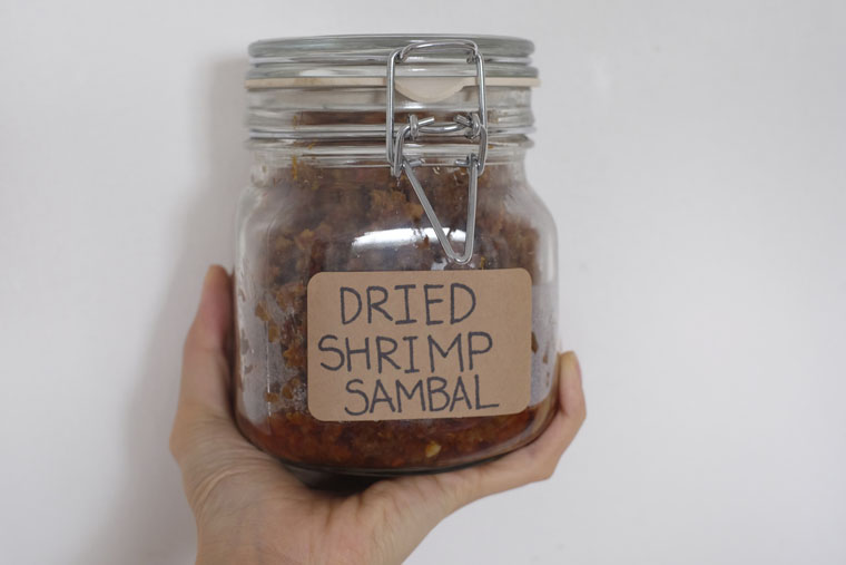 Blend 150 g shallots + 100 g red chillies + 1 bulb garlic + 40 g belacan into a paste. Stir-fry sambal until fragrant (10 min). Add 200 g blended dried shrimps. Fry for a while. Cool & store.