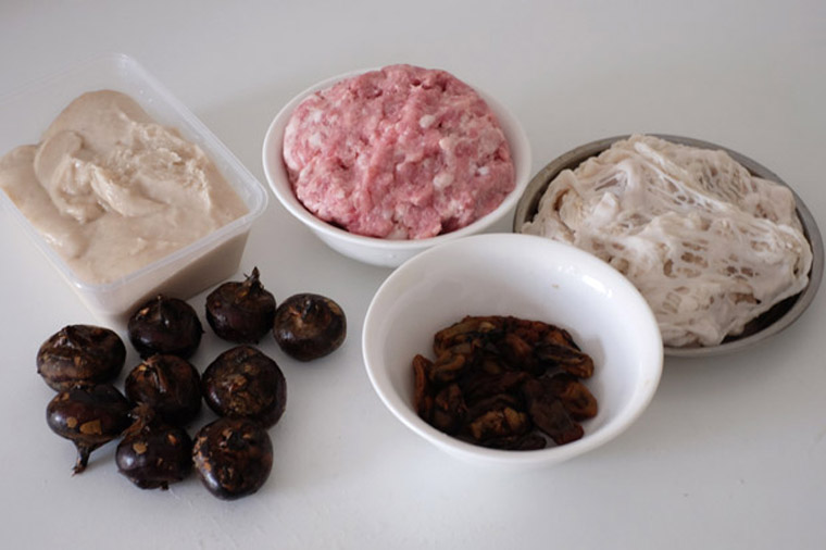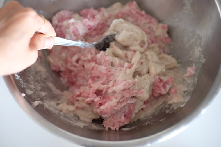 • Step 2 MIX & SEASON MEAT: In a large mixing bowl, toss in minced pork, fish paste, dried oyster and water chestnut. Mix well. Sprinkle salt, sugar and white pepper. Mix well.