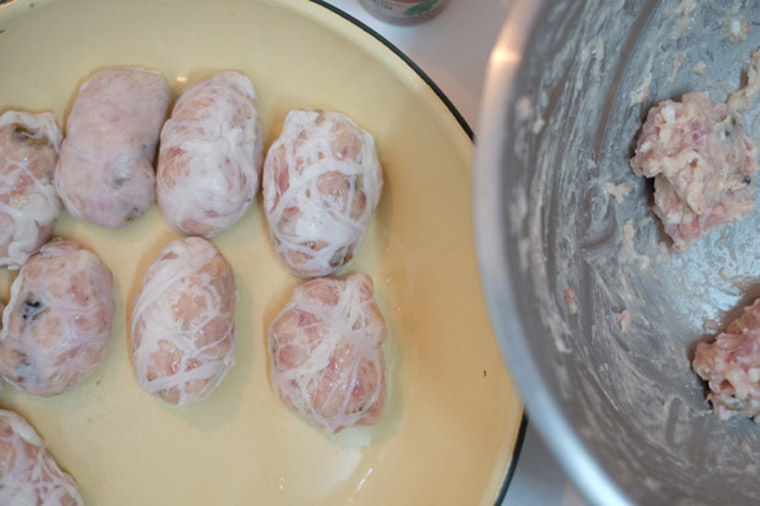 • Step 3 WRAP: Take a spoonful of mixed meat and place onto caul fat. Wrap it tightly