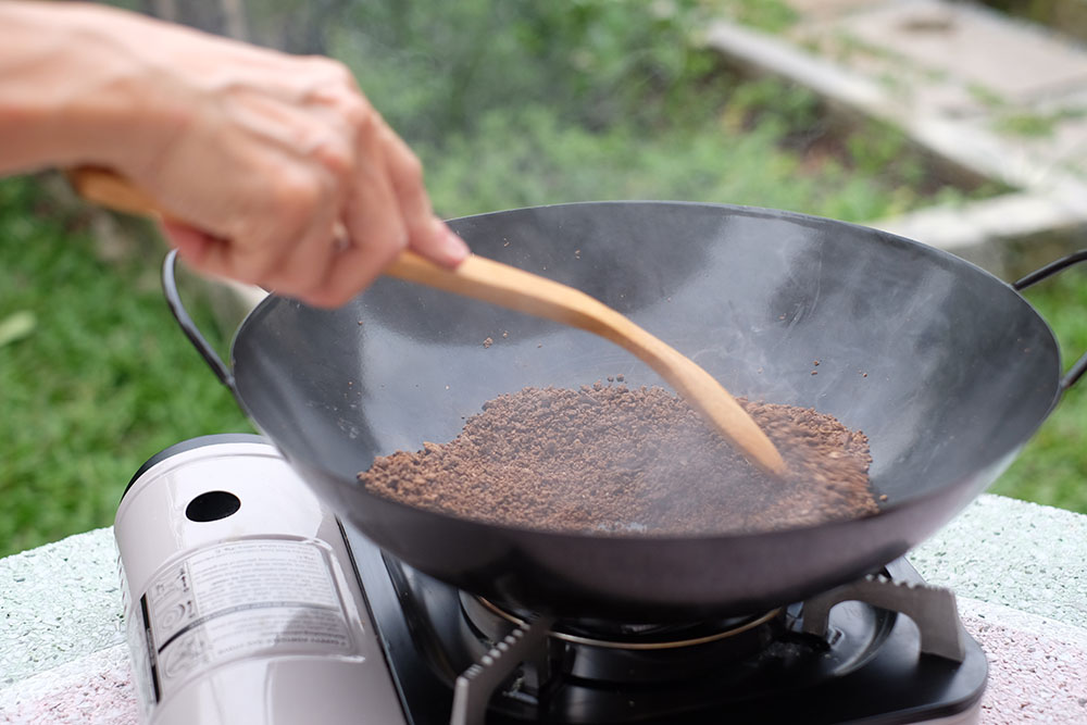 1. Cook in somewhere with good ventilation Belacan has an extremely strong smell in itself. When cooked, it emits an even more pungent smell that Europeans had mistaken for a corpse! (Read: French Neighbour Mistake Grilled Belacan To Be Rotten Corpse). So do make sure the kitchen has good ventilation. As I have a garden and a portable stove, I toast belacan in my garden.