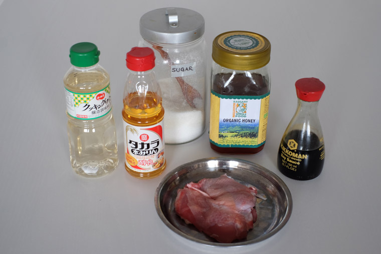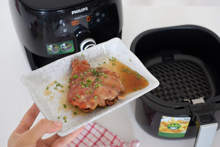 Poke skin with fork & sprinkle 1/8 tsp of salt of 1 chicken thigh. Add in a bowl: 1 tbsp soy sauce + 1 tbsp mirin + 3/4 tbsp sugar + 3/4 tbsp sake + 3/4 tbsp honey. Place chicken skin-down on Airfryer grill pan. Set to cook @ 180°C for 5 min. After 5 min, put in bowl of teriyaki sauce to cook for another 10 min. Slice & serve.