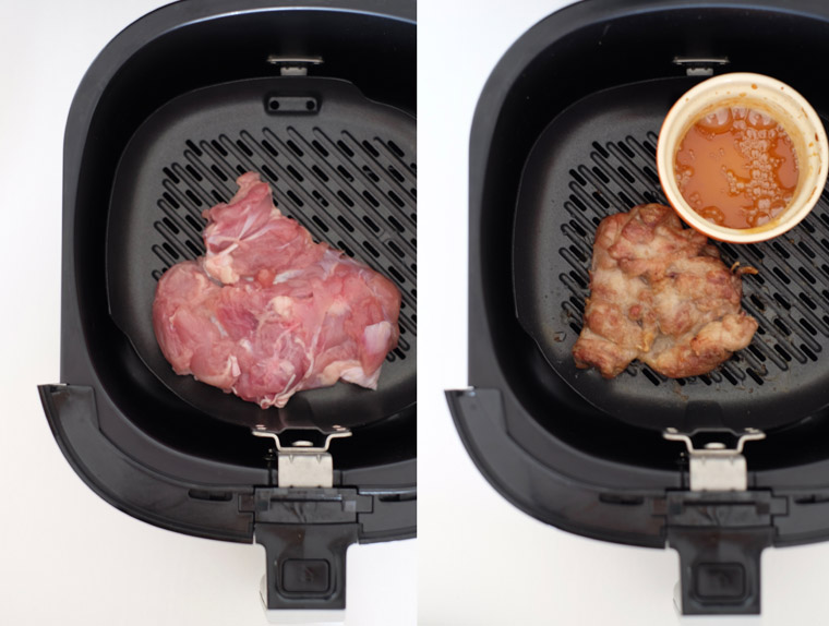 - Step 3 FRY CHICKEN :Place the chicken skin down on the grill pan (not the basket one which wouldn’t crisp up the skin). Place it at a corner to make space for the bowl of sauce. Cook at 180°C for 5 minutes.