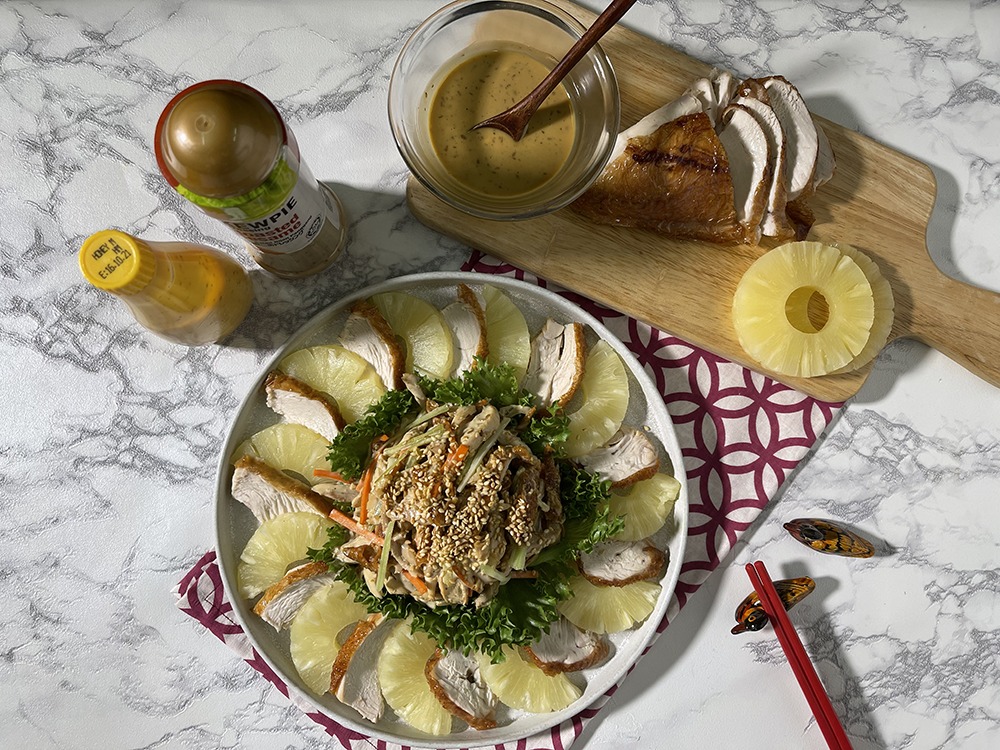 This is what we will do: buy a store-bought roast chicken and turn it into 'Two Way Pineapple Roast Chicken’ with Kewpie’s Roasted Sesame Sauce. Best of all, it can be done in just 15 minutes!