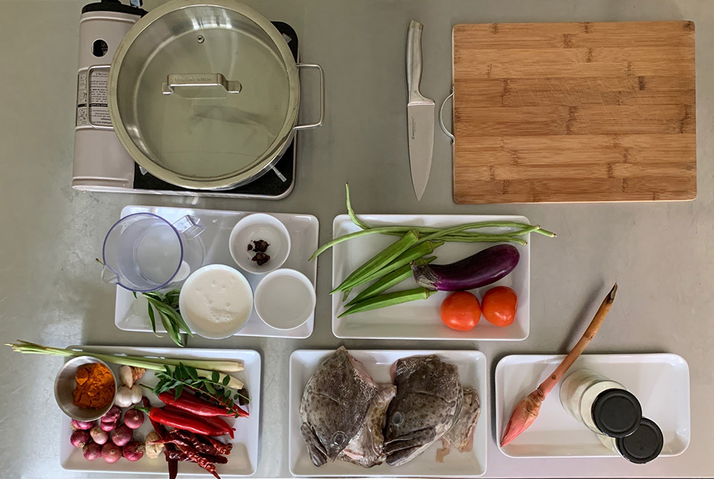 Blend spice paste: 4 tbsp fish curry powder + 10 shallots + 3 cloves Garlic + 1 cm ginger + 2 thumbsize galangal + 2 stalks of lemongrass + 5 fresh red chili + 1 1/2 tbsp shrimp paste + 2 tbsp oil. Cook spice paste in 1/2 cup oil + curry leaves. Add 3 cups of water + 1/2 tbsp tamarind paste + 2 stalks of laksa leaves. Bring to a boil. Add 1 brinjal + long beans. Simmer until veg soften (~5 min) Add 200 ml coconut milk+ 3 ladies fingers + 2 quartered tomato + 1 kg fish head. Simmer until fish softens (~5 min). Season with sugar (~1 tbsp) + salt (~2 tsp) + fish sauce. Garnish with torch ginger flower.