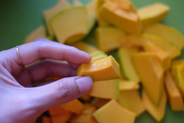 - Use a sharp cleaver. My least favourite part of making this dish is chopping the pumpkin. To make my task easier, I use a sharp cleaver/ Chinese knife to chop pumpkin and its tough skin. It’s much easier!