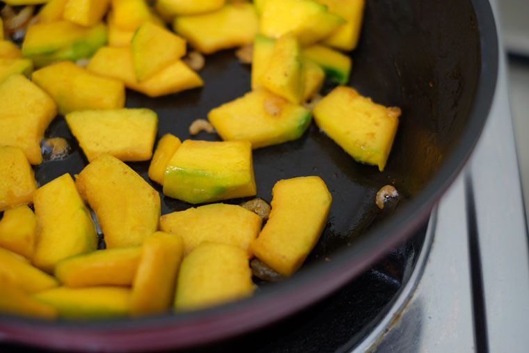 3. STIR-FRY PUMPKIN: Add in pumpkin and stir-fry until slightly golden (about 1 minute).