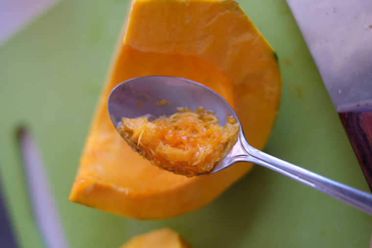 - Scrap off the fibre. While removing the pumpkin seeds with a spoon, scrap off the fibre too. This is to prevent the pumpkin from turning too mushy when cooked.