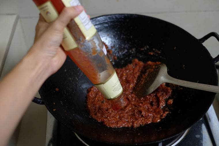 3. COOK SAUCE:. Add tomato sauce and plum sauce. Mix well. Then add water.