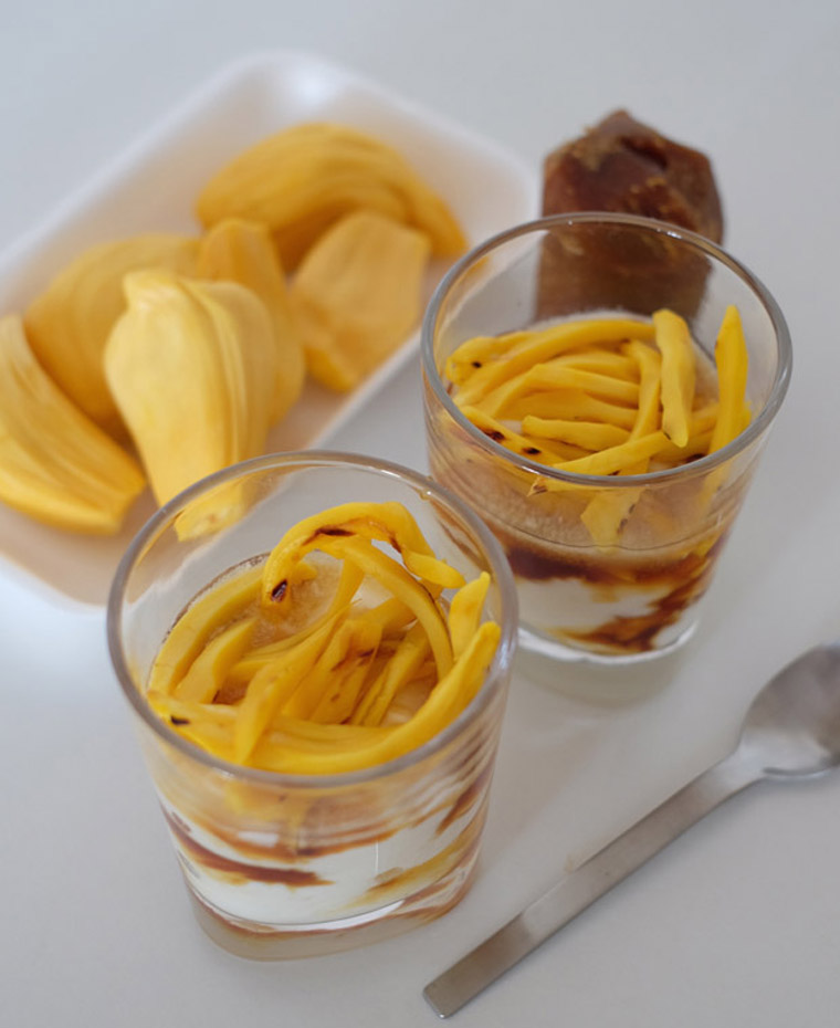 - Step 3 Scoop yoghurt into a clear glass, pour some gula melaka syrup onto it and top with sliced nangka.