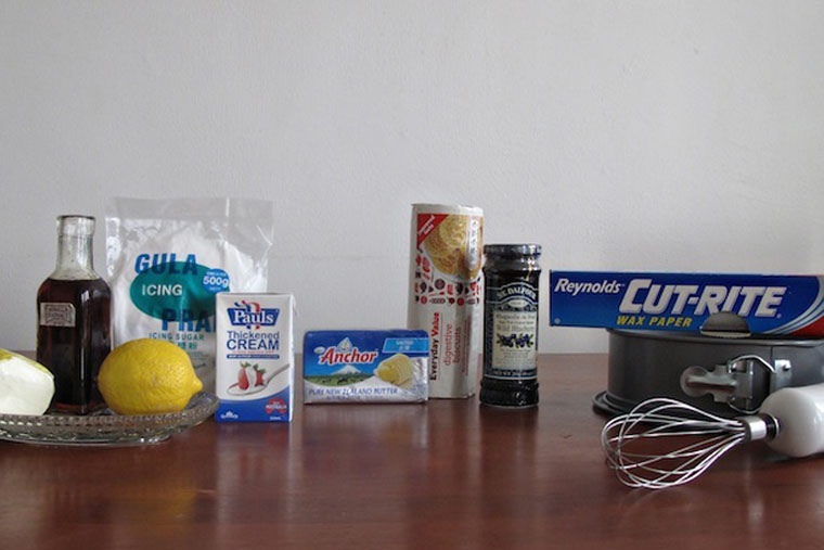Mix 9 pcs crushed biscuit + 75 g soften butter. Press biscuit mixture into a 20cm cake pan & refrigerate. Beat together 300 g cream cheese + 1/2 cup icing sugar + 1 tsp vanilla extract + 1/2 tsp lemon juice in a bowl until smoot..Whip 250 g double cream & fold it into the cream cheese mixture. Refrigerate overnight. Unmould & spread the blueberry jam on top.