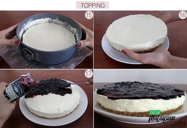 - Step 3 SPREAD TOPPING: When you are ready to serve the cheesecake, unmould it and spread the blueberry jam on top.